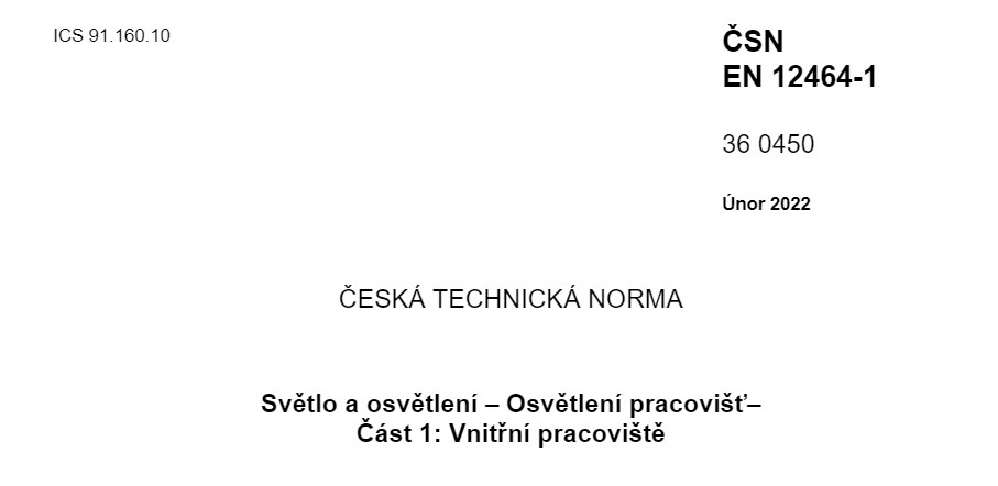 Nová norma na osvětlení vnitřních prostor je již k dispozici k zakoupení, zatím pouze v angličtině. Světlo a osvětlení – Osvětlení pracovišť- Část 1: Vnitřní pracoviště, ČSN EN 12464-1 (360450)